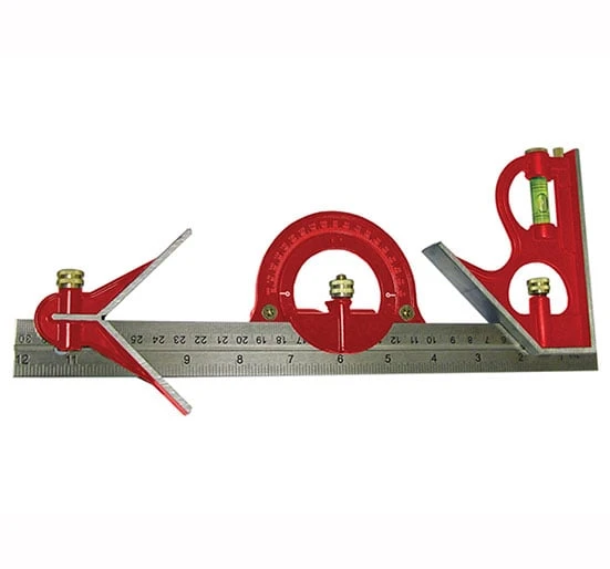 300 mm measure with metric and imperial scale, 90 degree inside square, 90 degree outside square, 135 degree inside square, 45 degree inside square, horizontal level, vertical level, T-square slide, marking gauge, depth gauge.